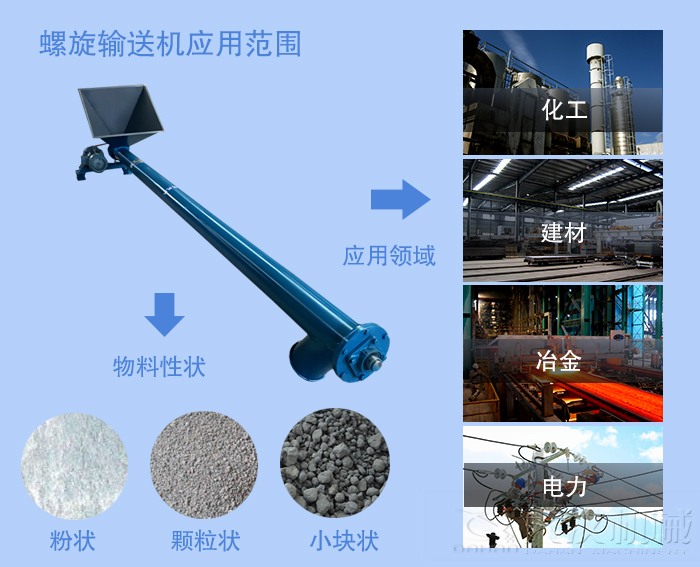 螺旋机广泛应用于建材,化工,电力,冶金,木炭,粮食等行业。 它适合水平或倾斜地输送粉状,颗粒状和小块状物料,例如煤,灰,渣,水泥和谷物等,输送物料温度低于200°C。 螺旋输送机不适用于输送容易变质,黏稠和结块的物料。