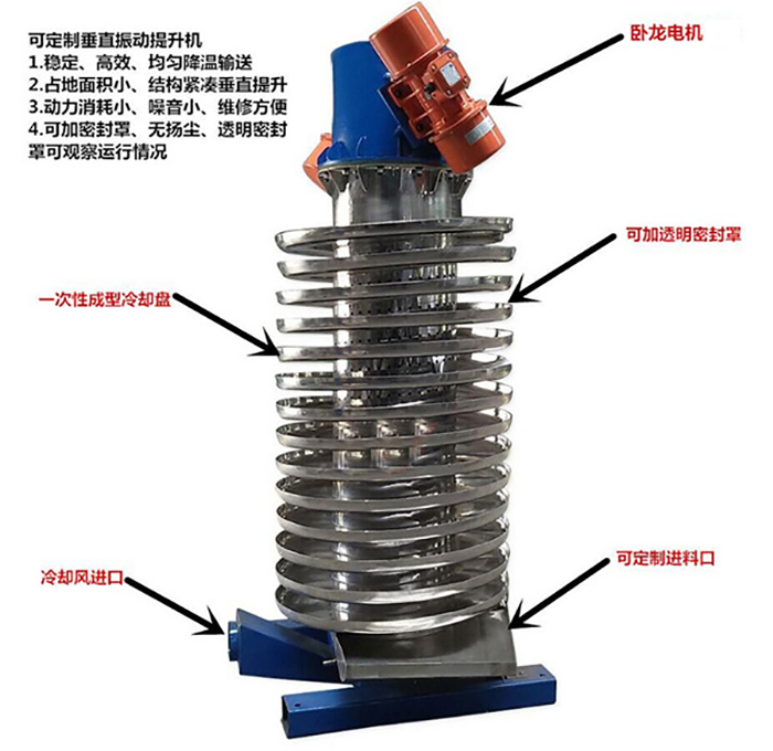 垂直振动提升机也叫做DZC垂直振动输送机,是一种新型的垂直振动提升和输送设备,本机对一切颗粒状、块状、粉状的固体物料(粘度不)都可以输送。广泛应用于矿山、冶金、机械、建材、化工、橡胶、医药、电力、粮食、食品等行业的块状、粉状和短纤维状固体物料的提升,DZC型振动输送机在向上提升物料的同时,还可以完成对物料的干燥和冷却。分开槽式、封闭式两种结构,并可根据不同的工艺要求,设计物料颗粒分级作用的筛选提升机及设计易燃易爆物料的提升机。